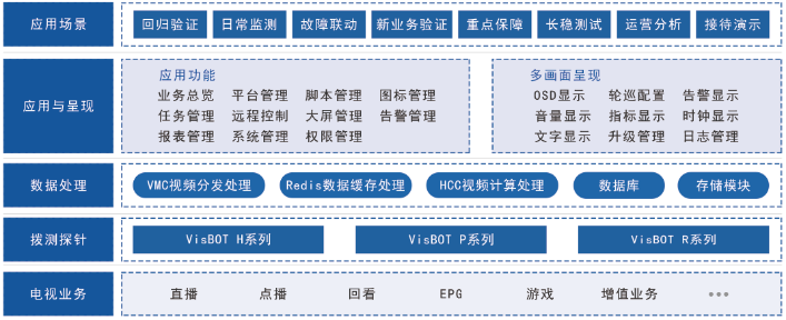 五層架構(gòu)設(shè)計:電視業(yè)務(wù)層、撥測探針采集層、數(shù)據(jù)處理層、應(yīng)用呈現(xiàn)層、應(yīng)用場景層