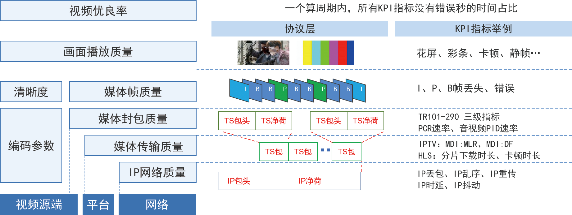 支持從網(wǎng)絡(luò)層到編碼層全協(xié)議棧質(zhì)量分析能力,并綜合一個“優(yōu)良率”指標反應(yīng)直播的實際體驗。